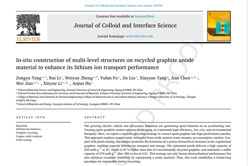 近日,材料学院陈建教授团队研究生杨宗宇在锂离子电池负极回收研究方面取得突破,相关研究成果以《In-situ construction of multi-level structures on recycled graphite anode material to enhance its lithium ion transport performance》为题发表于国际顶刊《Journal of Colloid and Interface Science》(IF:9.8 中科院1区Top)。